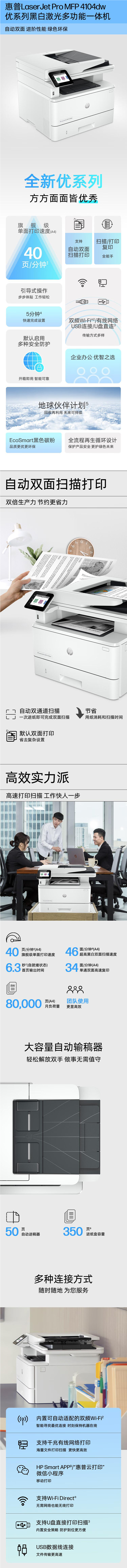 惠普(HP) 4104dw黑白自动双面无线激光打印机 打印复印扫描一体机 无线连接 连续复印 企业办公商用
