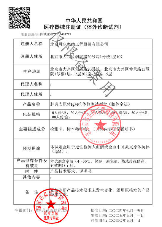Bei er 肺炎支原体lgM抗体检测试剂盒(胶体金法) 20T