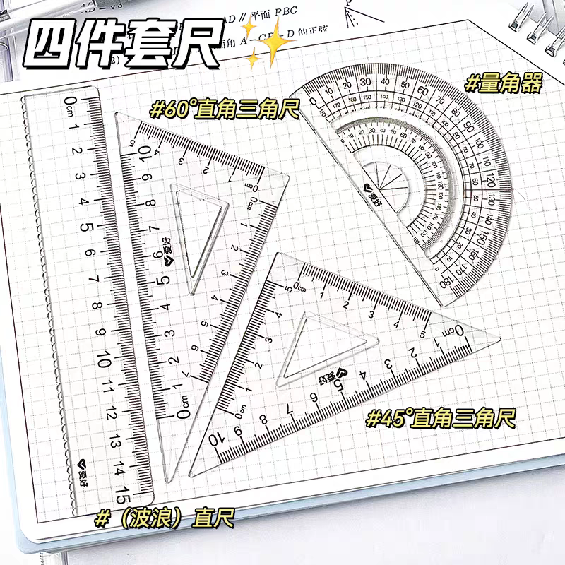 大字体套尺RL4025四件套直尺带波浪线15cm尺子中小学生专用三角尺量角器18cm尺子套装套尺透明学生用绘图工具