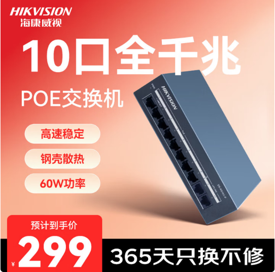 海康威视(HIKVISION) 8口千兆POE交换机 网线供网供电 安防监控国标网络网线分线器 DS-XS10G-P