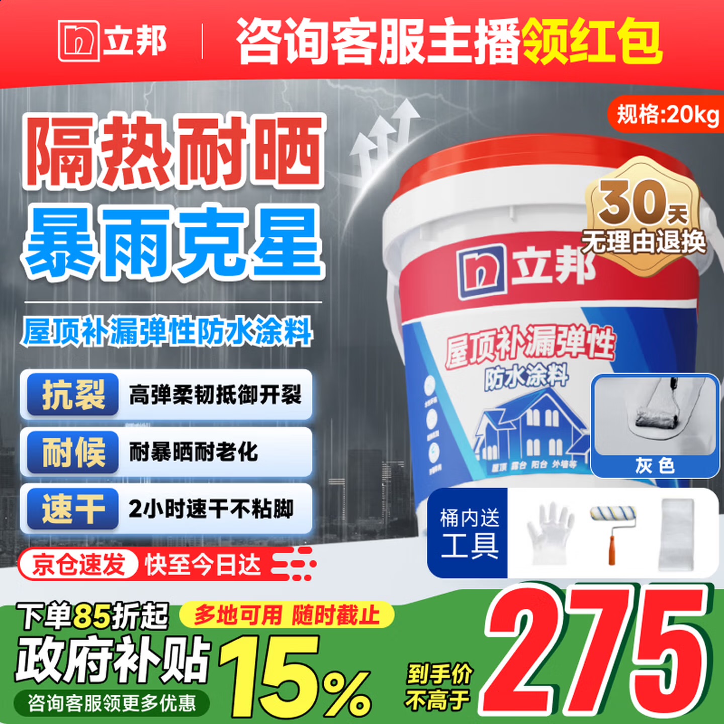 立邦 屋顶防水涂料防水材料屋顶漏水房顶漏水耐高温防晒防冻补漏王 [抗冻防裂] 灰色40斤 -约刷20㎡2遍 桶