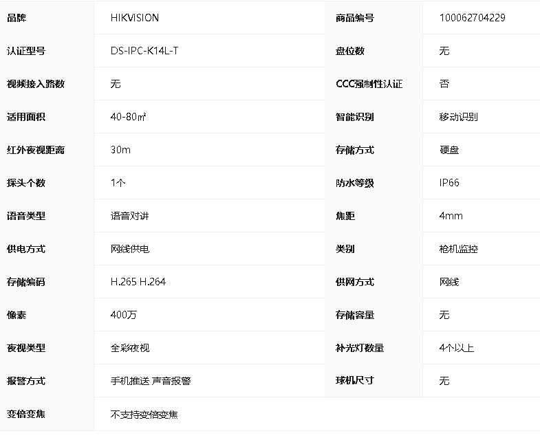 海康威视(HIKVISION) DS-IPC-K14L-T臻全彩400万网络监控摄像头