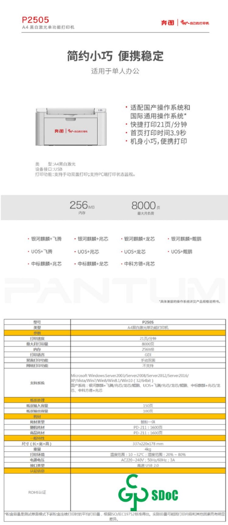 奔图(PANTUM) P2505 A4黑白激光单功能打印机